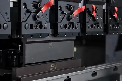 Our quick-release press brake tooling clamps enable the removal of top tooling from the front of the clamp in a vertical position, eliminating the need to slide all the tooling on your press brake left or right.
